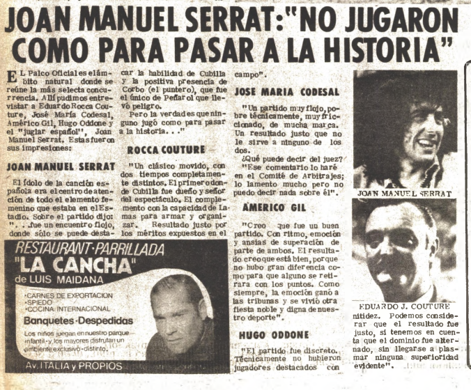 Un día de 1968 Serrat fue a ver un entrenamiento de su equipo y los jugadores lo invitaron a participar. Se cambió, entrenó con el Barca e hizo fútbol. Y la revista Barcelonista le hizo un interesante reportaje. En un momento, ante la pregunta sobre sus ídolos deportivos, dice: “Mis grandes ídolos actuales en fútbol y automovilismo eran Benítez y Jim Clark. Los dos tuvieron la desgracia de desaparecer el mismo año”. Cuando nombra a Clark está hablando del piloto de carreras británico, bicampeón mundial, y cuando nombra a Benítez habla nada menos que de Julio César Benítez, otro crack uruguayo (con origen en el Racing Club), ídolo del Barcelona, muerto en extrañas circunstancias, provocando un gran luto en toda la afición catalana, que lo tenía como uno de sus mejores.