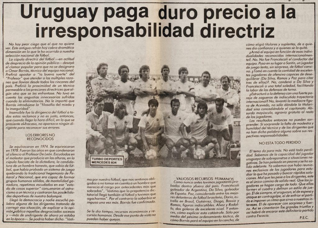 También apunta Fernández que el director técnico uruguayo no convocó a Hugo de León ni a Ruben Sosa que se encontraban en pleno desarrollo de sus carreras en Gremio y Zaragoza respectivamente.